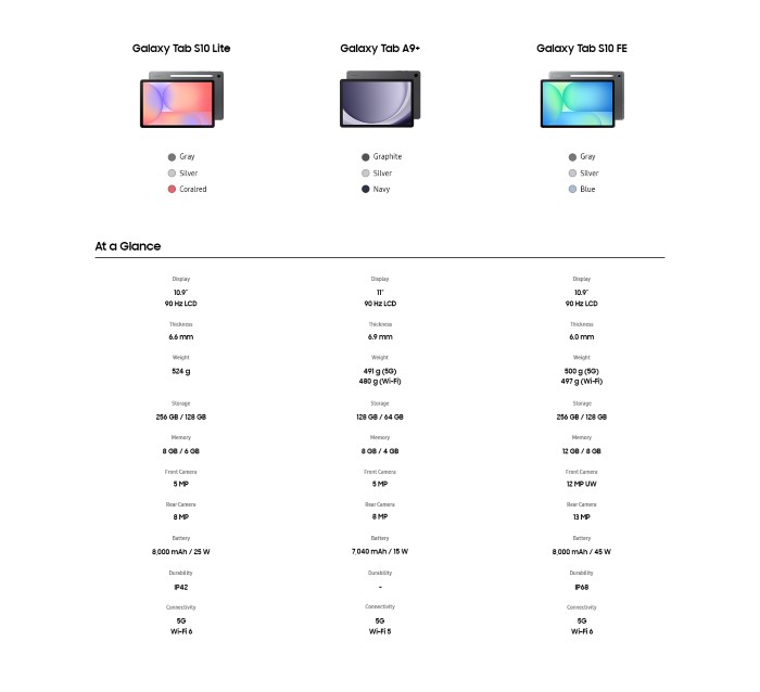 Galaxy Tab S10 Lite sẽ có mặt trên thị trường từ ngày 5 tháng 9 với hai màu: Xám và Bạc. Giá bán lẻ đề nghị như sau: